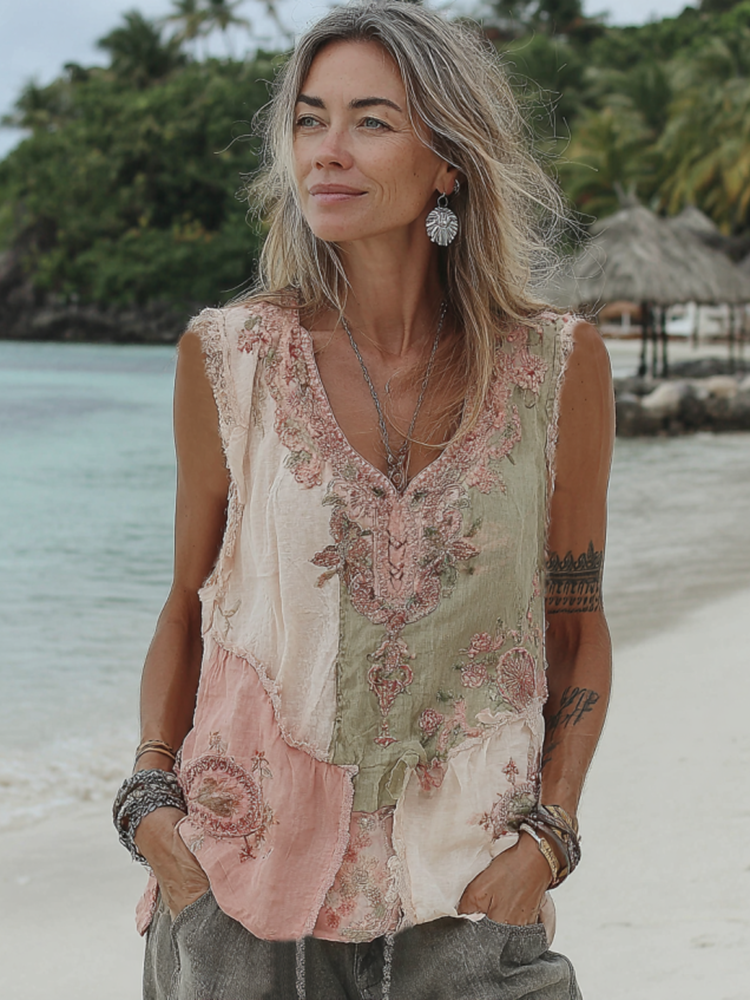 Women's Vintage Floral Art Linen Patchwork Sleeveless Top
