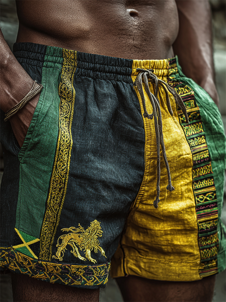 Men's Reggae Lion & Jamaica Flag Embroidered Patchwork Linen Shorts
