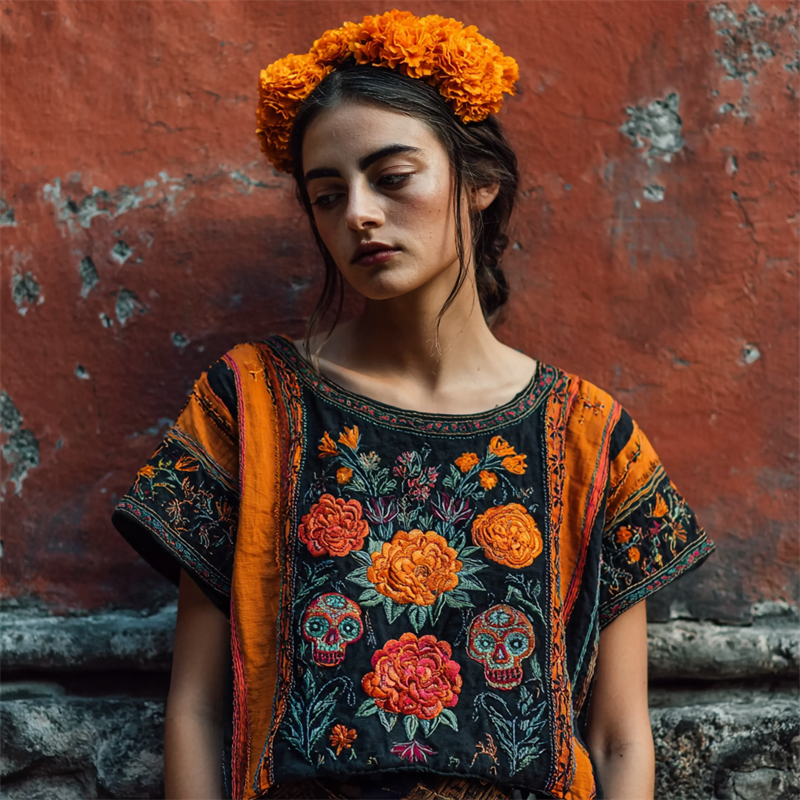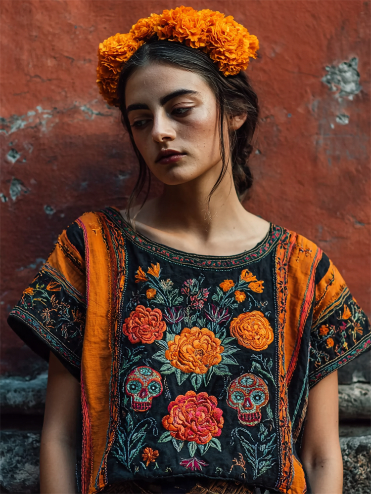 Day Of The Dead Sugar Skulls Marigolds Floral Embroidered Contrast Linen Shirt