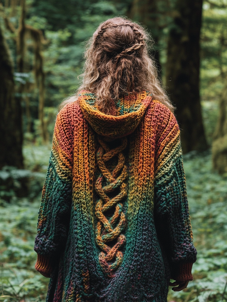 Women's Celtic Knot Retro Rainbow Chunky Knit Hooded Cardigan