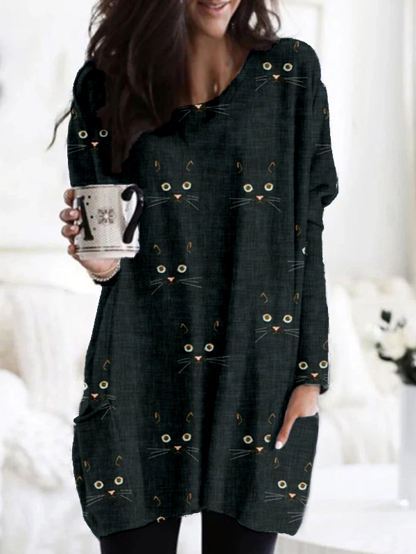 Cute Cat Face Pattern Patch Pocket Comfy Tunic