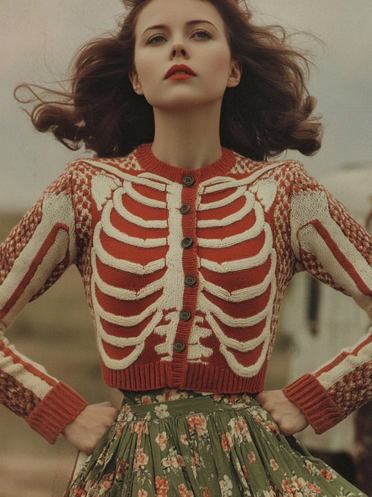 Women's Vintage Skull Ribs Pattern Knit Sweater Cardigan