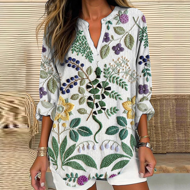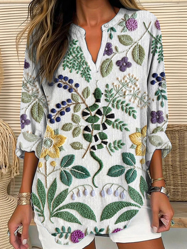 Women's Snake & Floral Japanese Embroidery Linen Blend Shirt