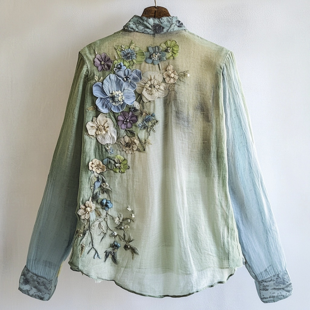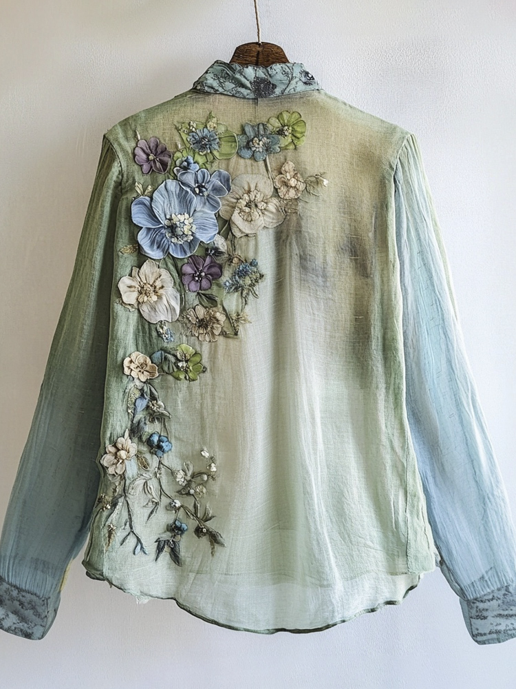 Retro Floral Embroidery Art Print Cotton And Linen Blend Loose Blouse
