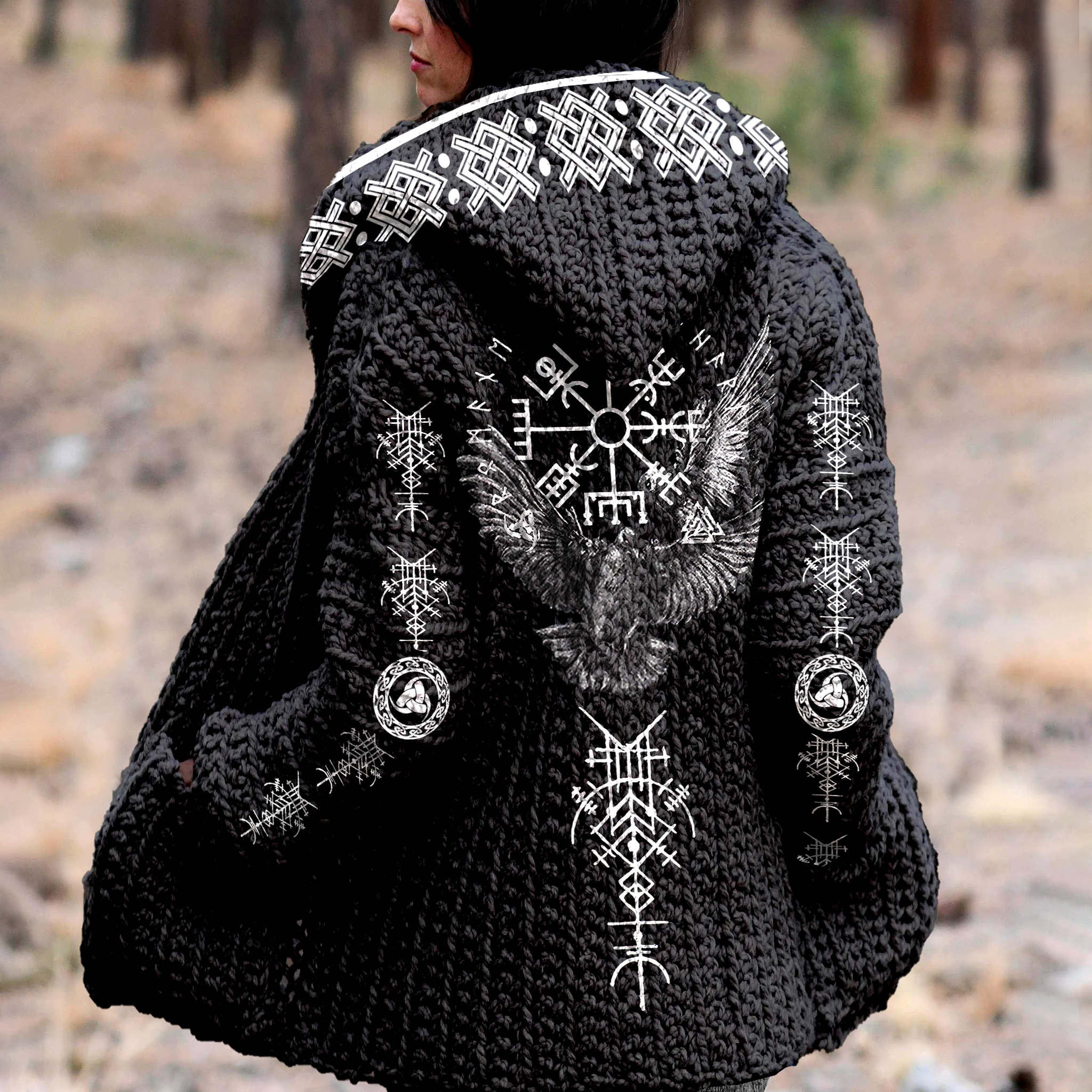 Retro Tribal Bird Viking Ethnic Graphics Hooded Cardigan Sweater