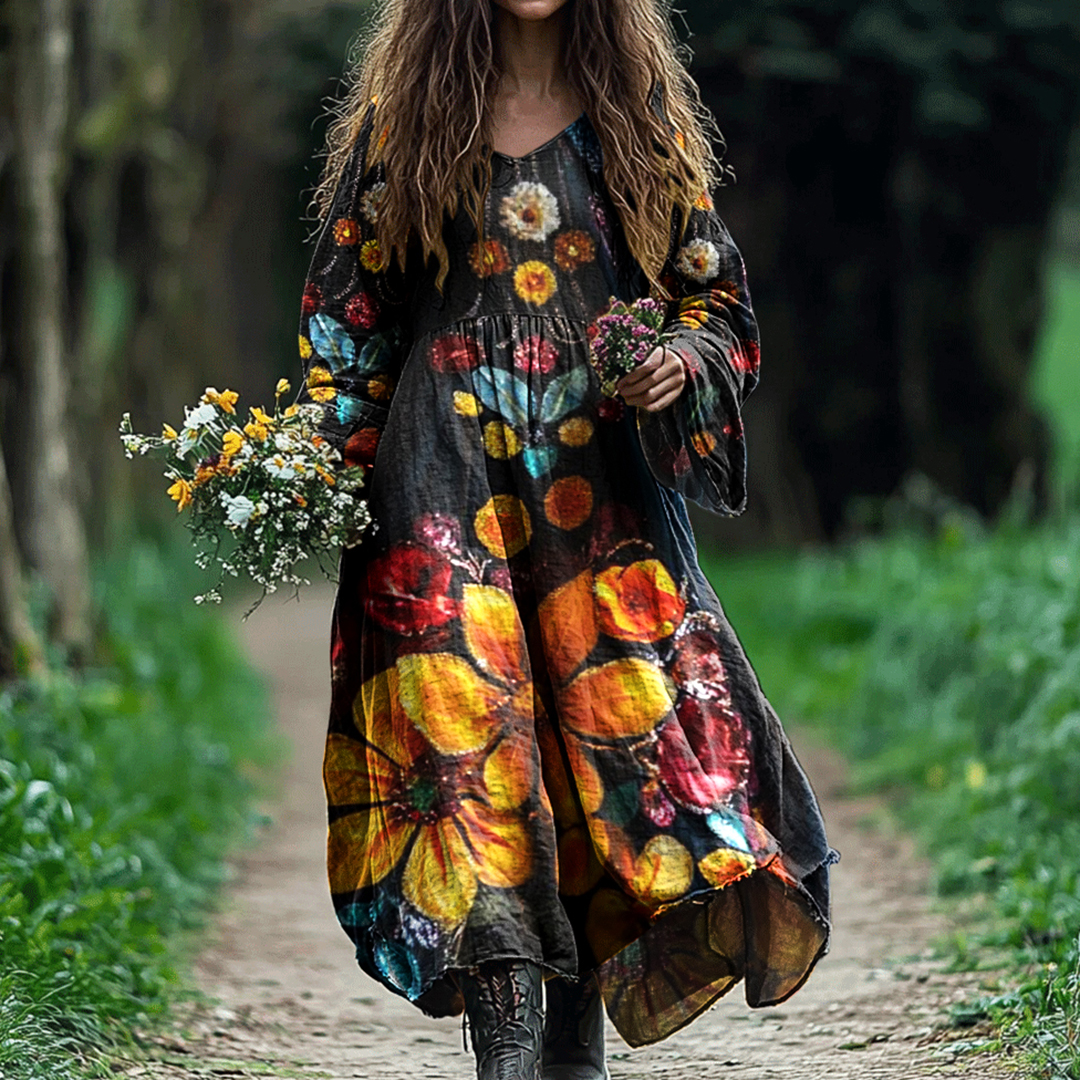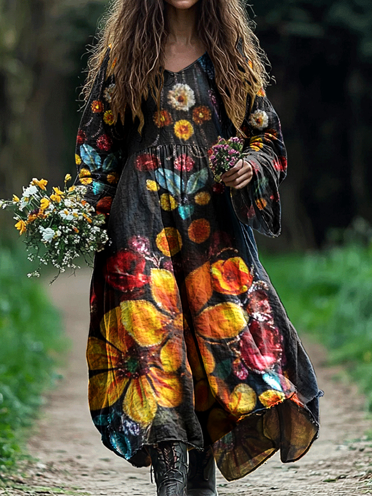 Vintage Boho Floral Art Linen Blend Maxi Dress