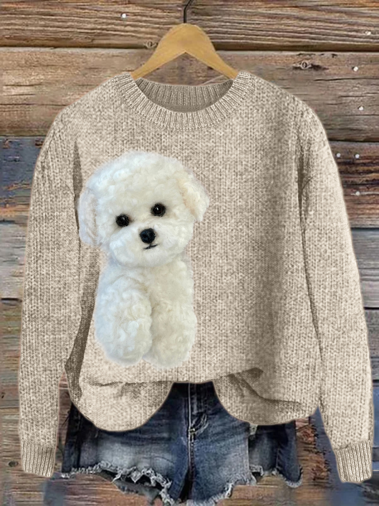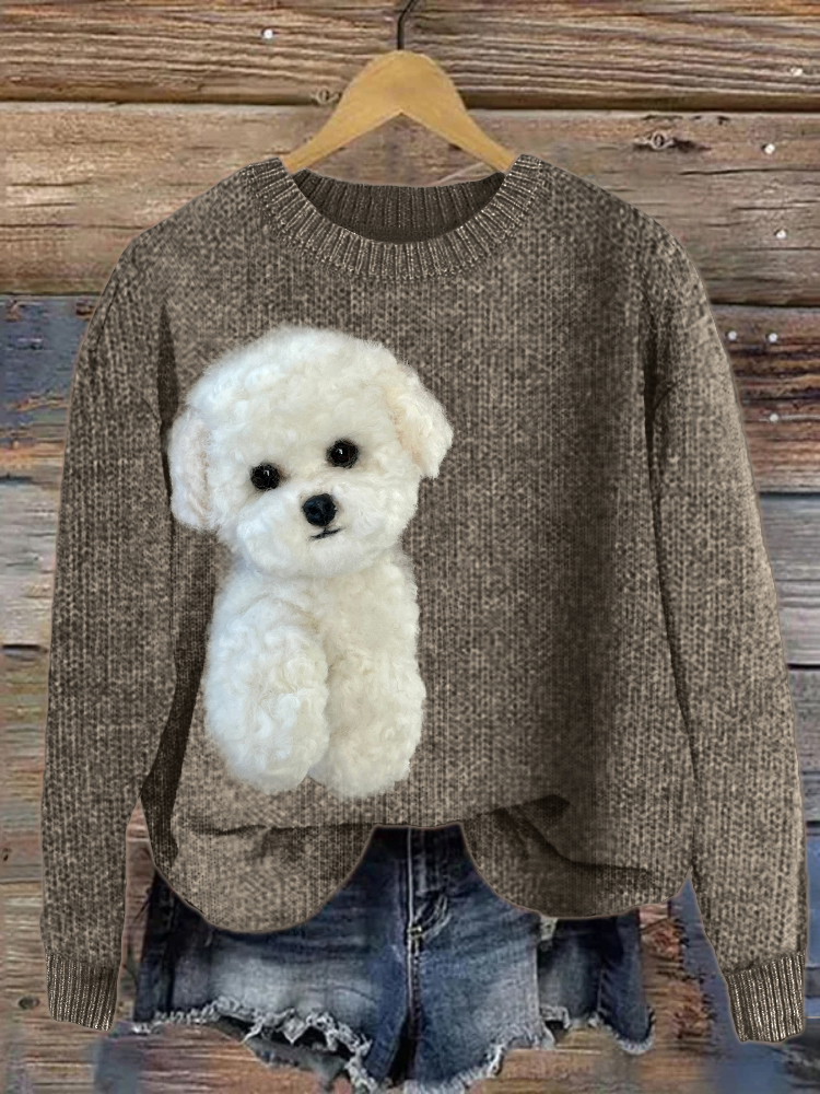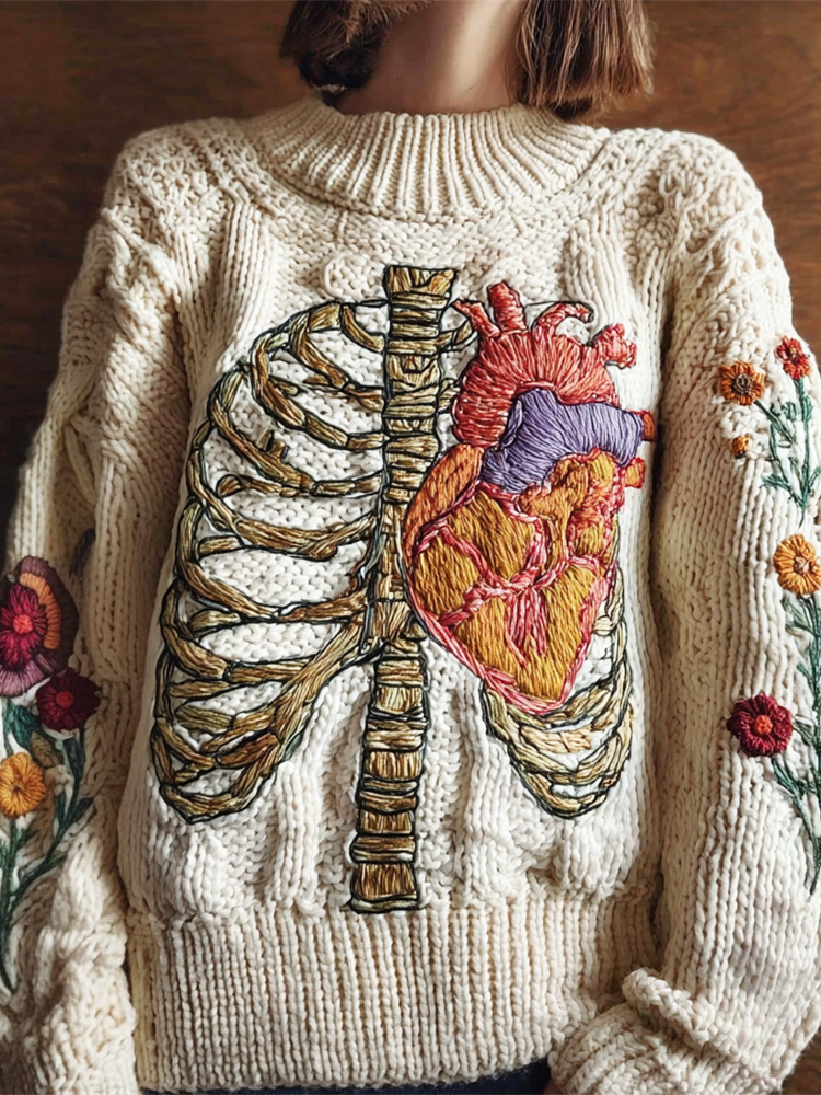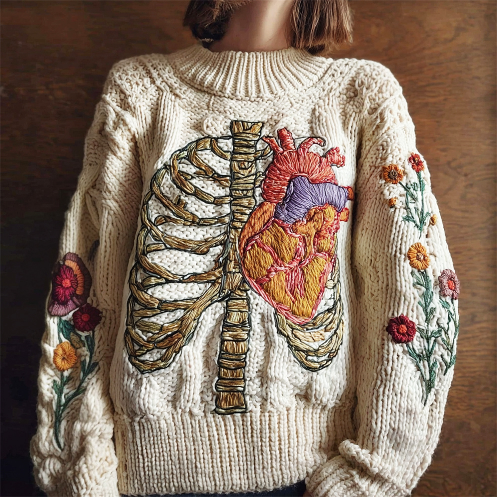 Vintage Anatomy & Heart Embroidery Women's Knit Crew Neck Sweater