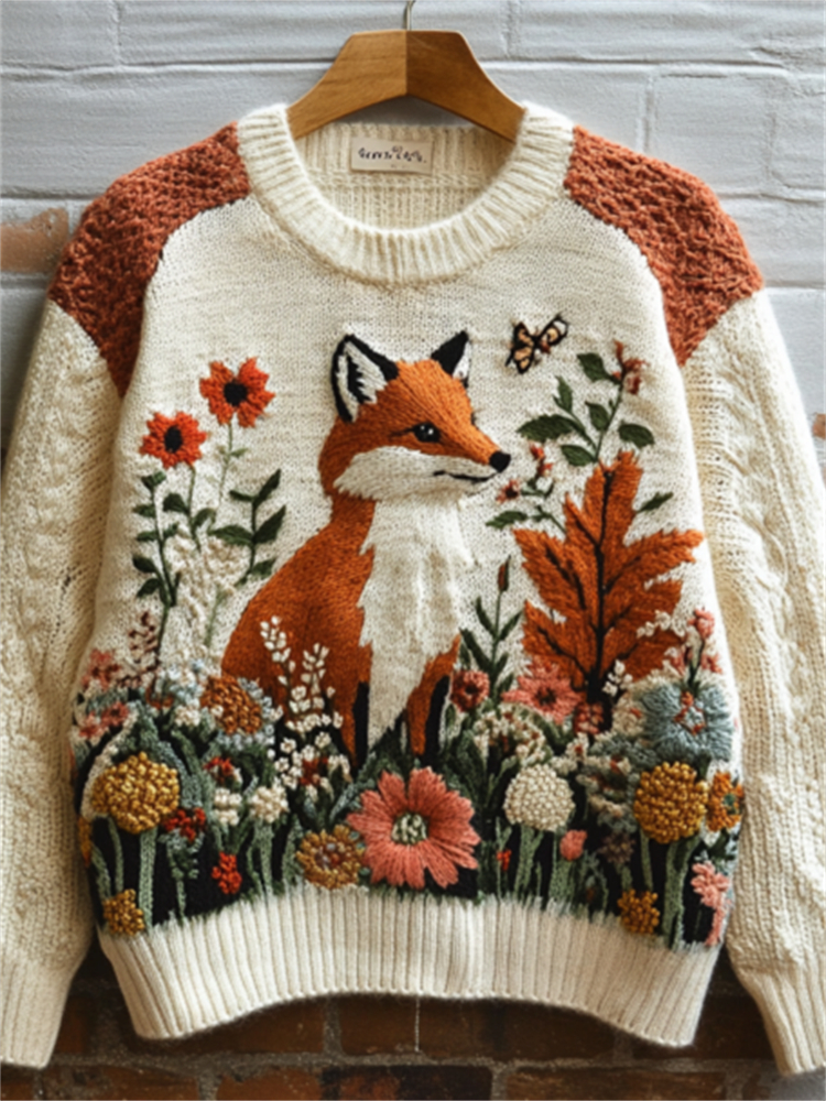 Forest Fox & Flowers Embroidered Cozy Knit Sweater