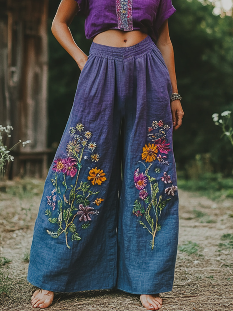 Bohemian Holiday Style Linen Bohemian Floral Gradient Print Linen Long Loose Wide-leg Pants