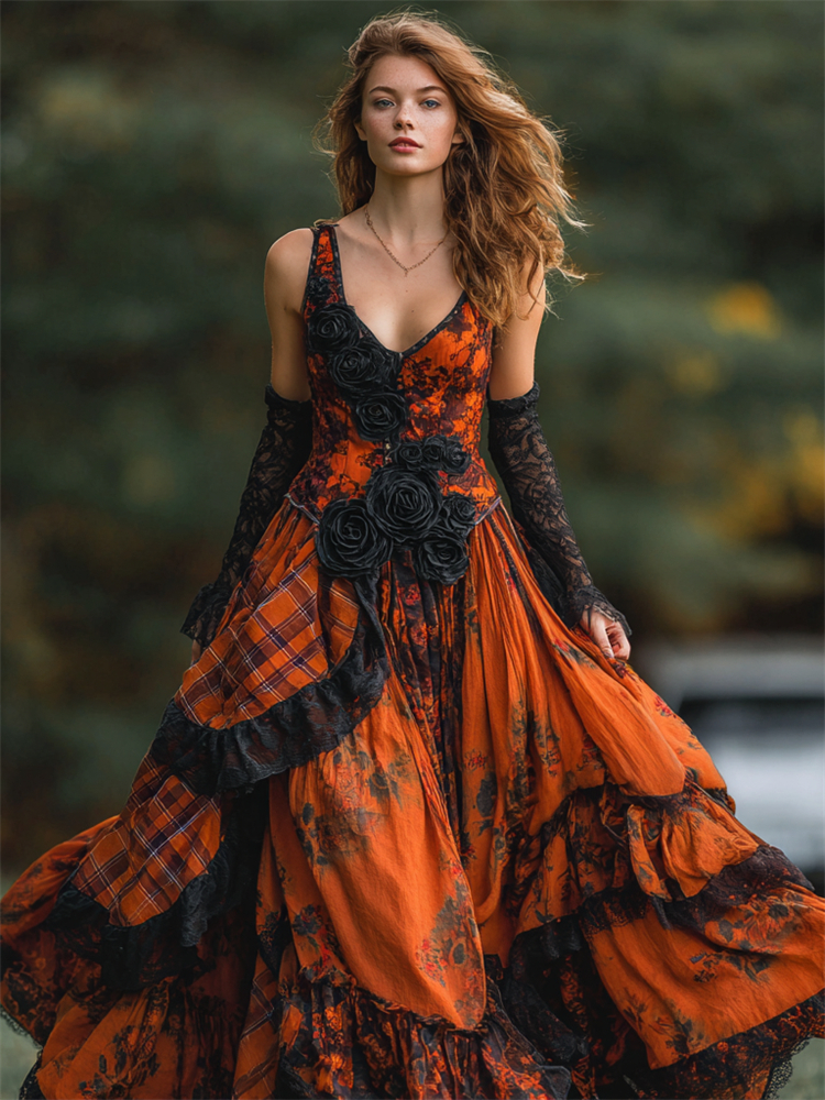 Vintage Gothic Black Roses Plaid Flowy Maxi Dress