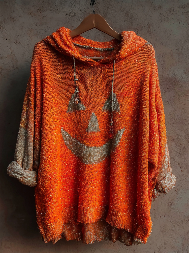 Halloween Pumpkin Face Glitter Sequins Bleached Cozy Knit Hooded Sweater