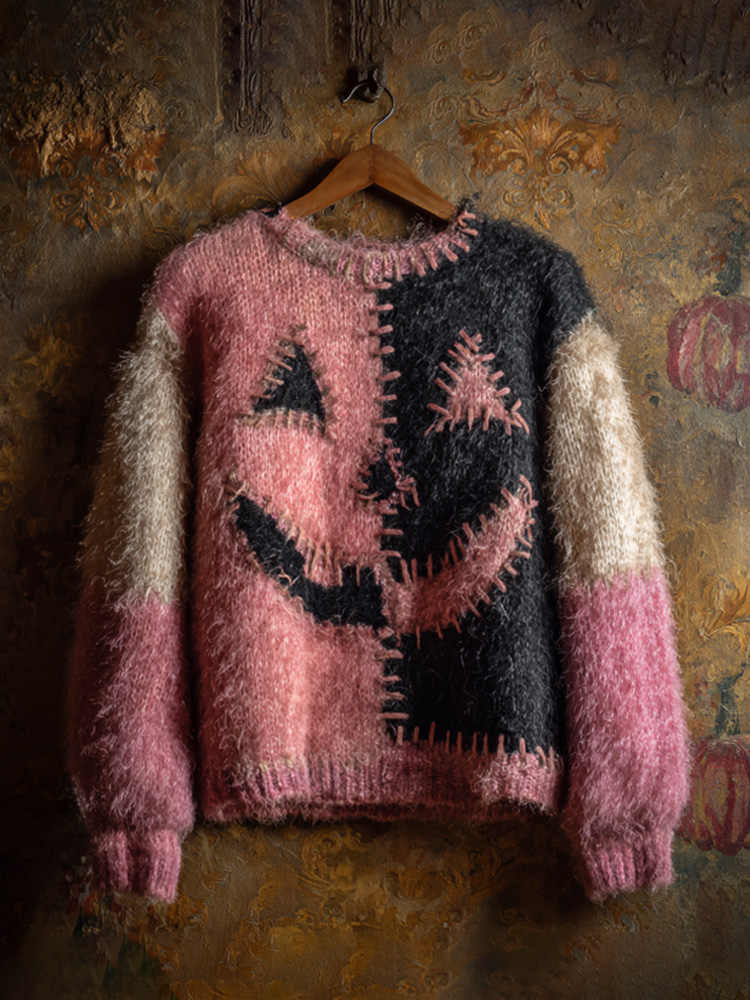 Women's Vintage Halloween Pink Ghost Face Knit Sweater