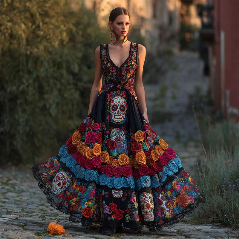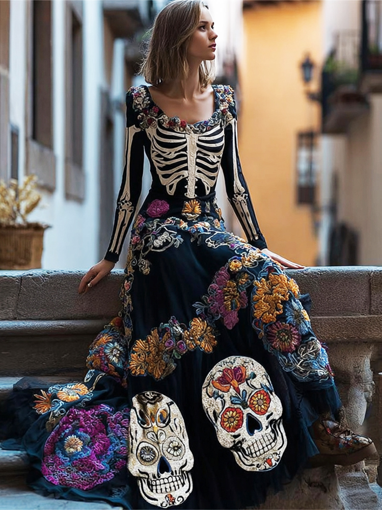 Mexican Skull & Skeleton Embroidered Women's Long-sleeved Flowing Maxi Dress
