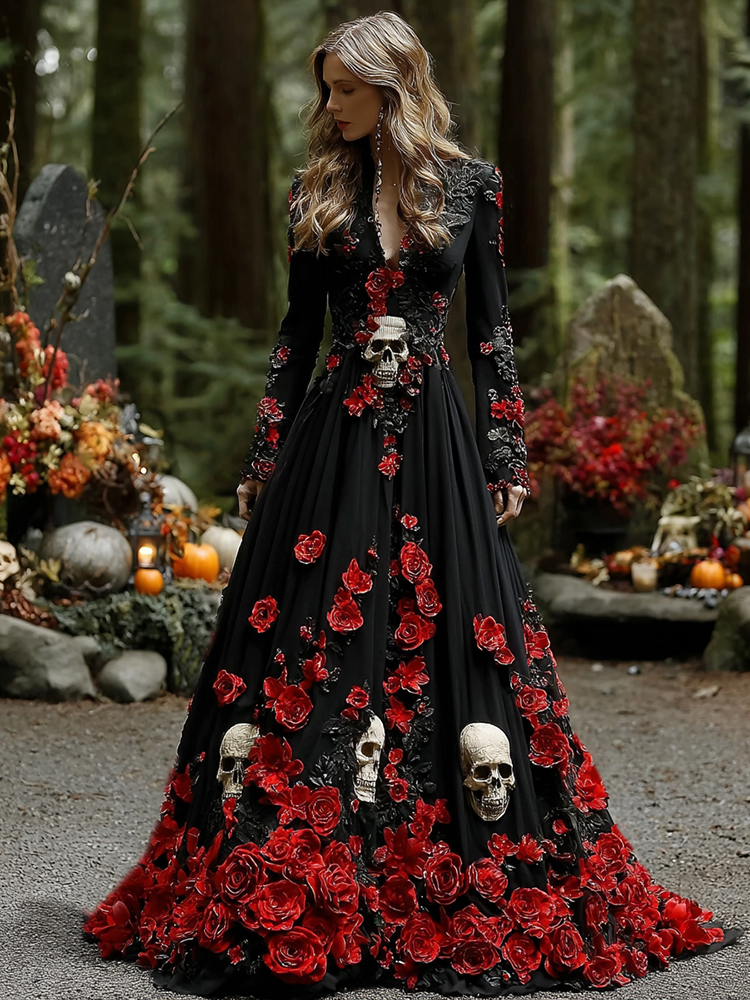 Women's Elegant Red Rose Skull Pattern V-neck Long Sleeve Maxi Dress