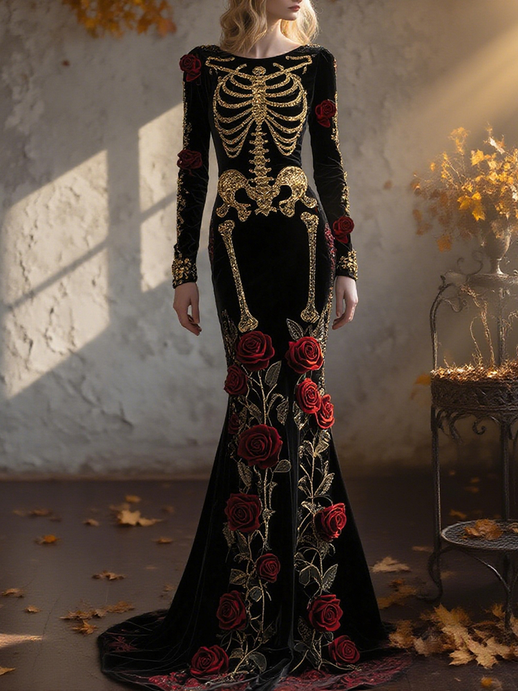 Women's Vintage Skull Rose Comfortable Elegant Velvet Maxi Dress