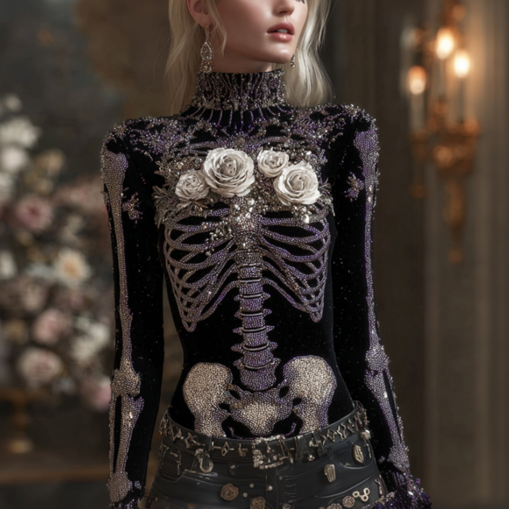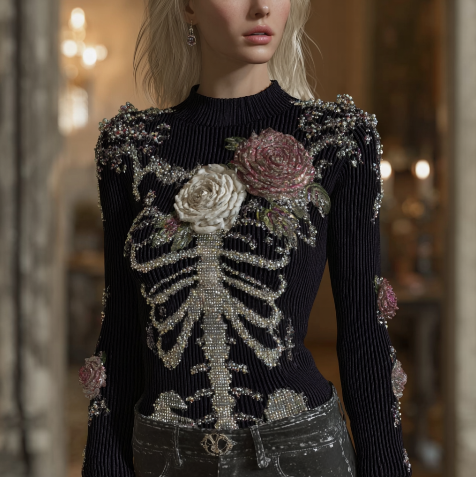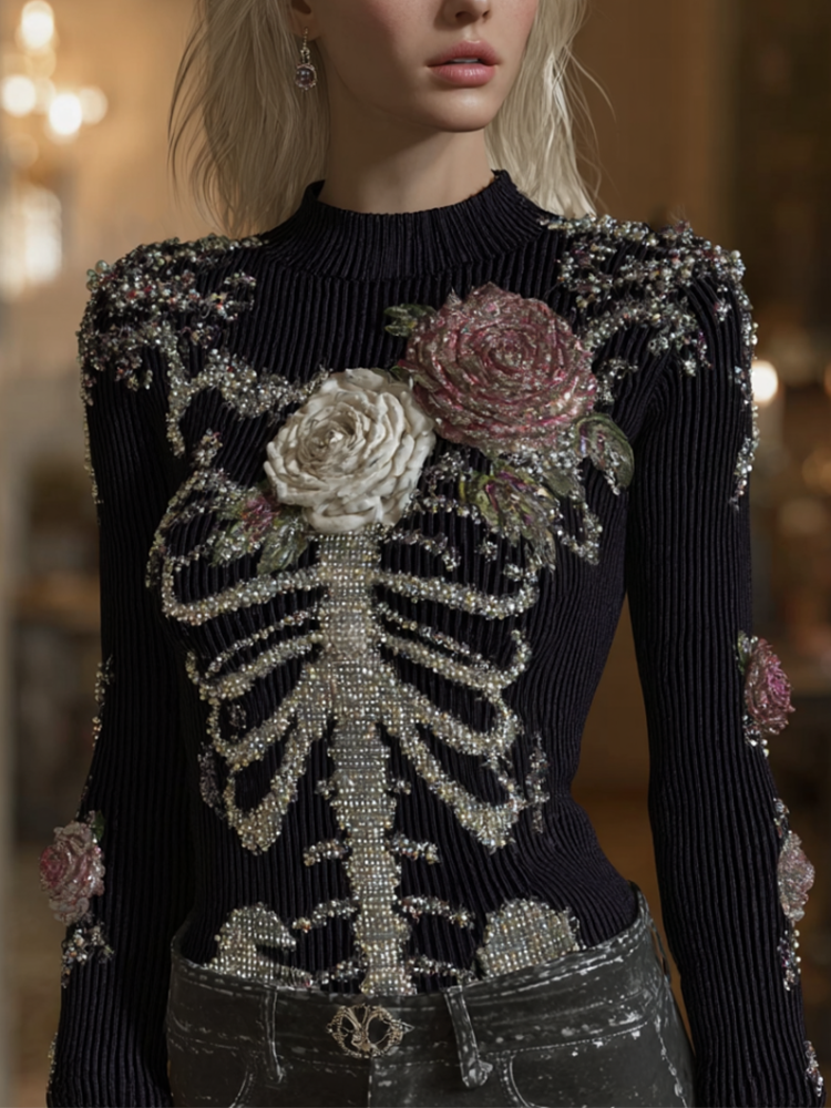 Elegant Skeleton & Floral Women's Turtleneck Knit Sweater