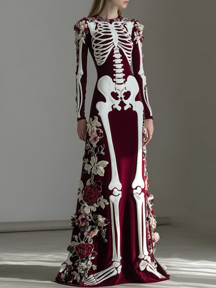 Women's Halloween Red Rose Skeleton Velvet Round Neck Maxi Dress