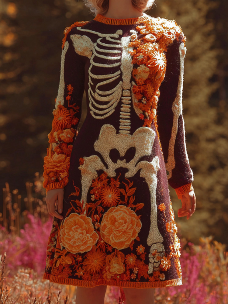 Women's Halloween Skeleton Bones With Rose Art Cozy Knit Mini Sweater Dress