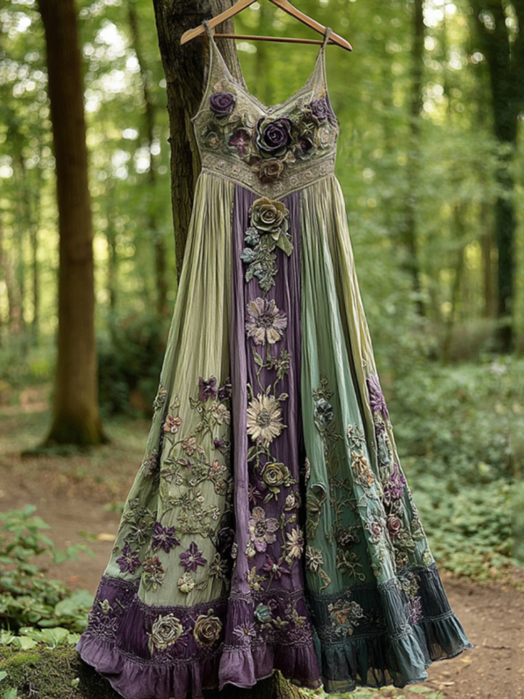 Women's Vintage Embroidered Pansy Floral Gradient Color Belt Maxi Dress