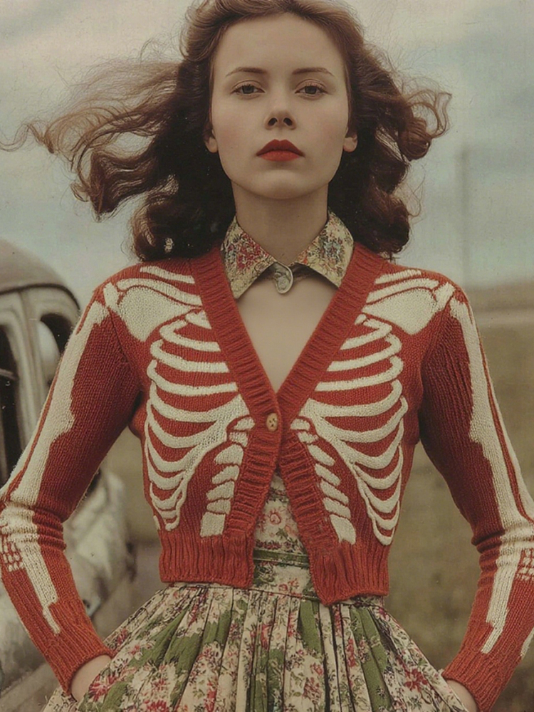 Women's Vintage Skull Ribs Pattern V Neck Cozy Knit Sweater Cardigan