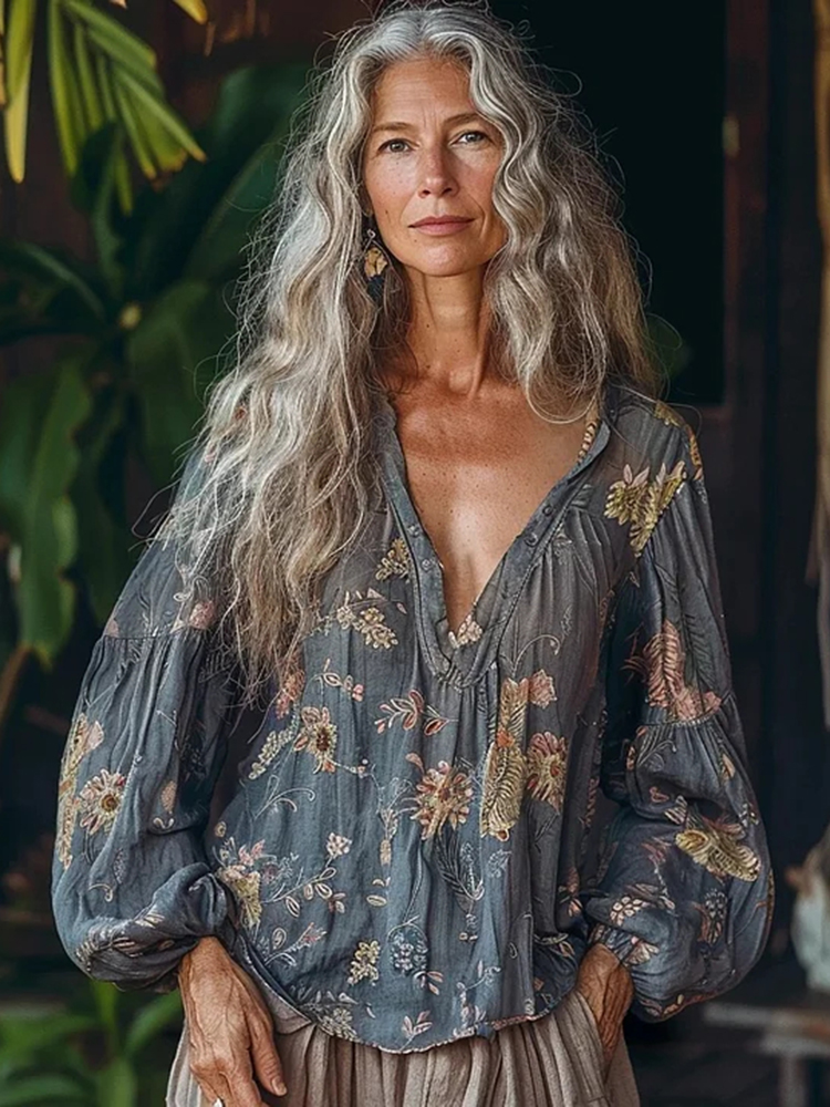 Vintage Bohemian Floral Linen Art Print Long Sleeve V-neck Shirt