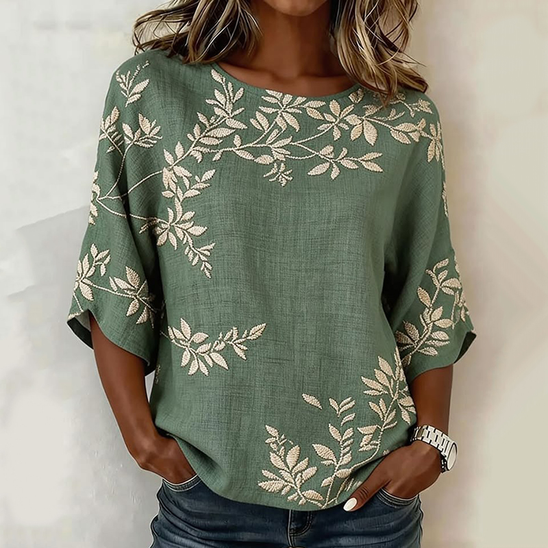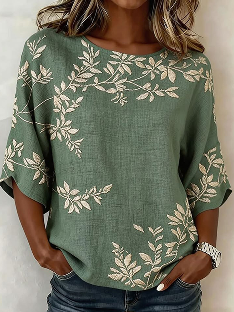 Women's Vintage Floral Embroidered Art Flowy Linen Blend Three-quarter Sleeve Tops