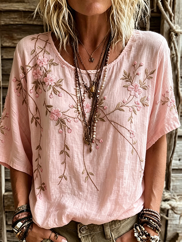 Women's Vintage Floral Embroidered Art Flowy Linen Blend Short Sleeve Casual Tops