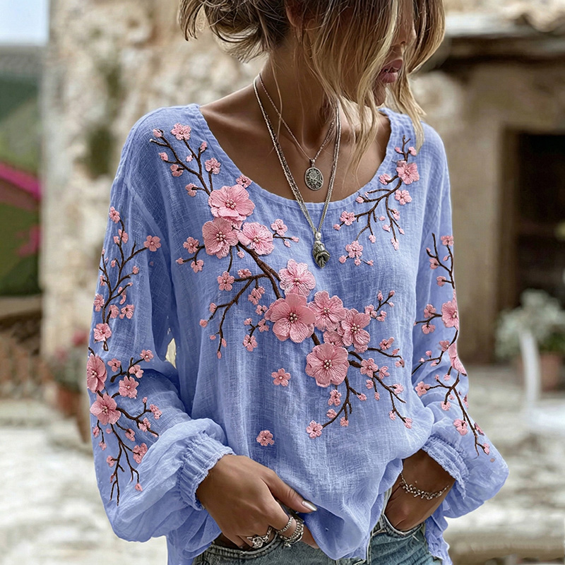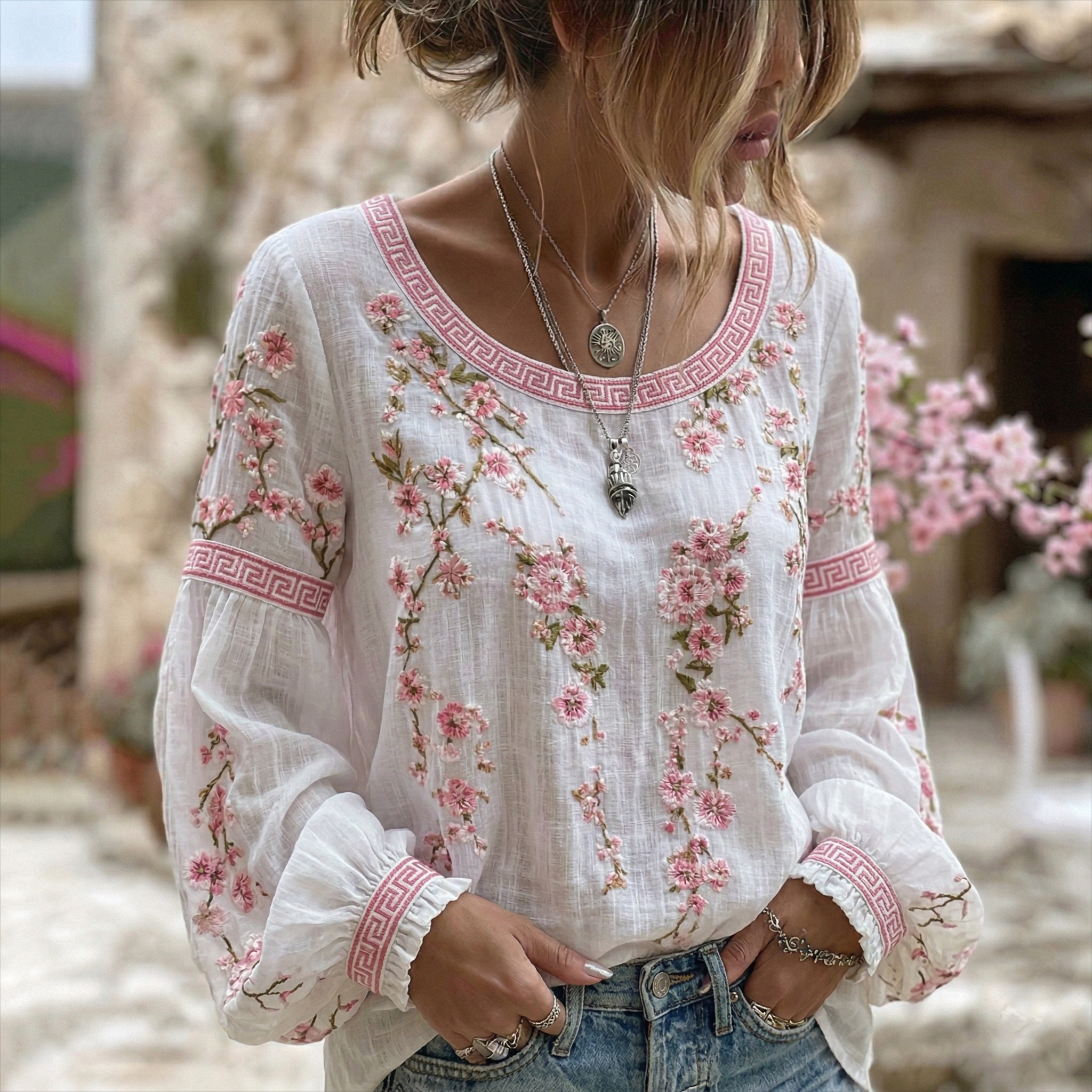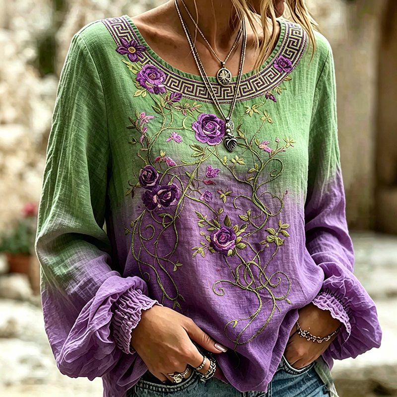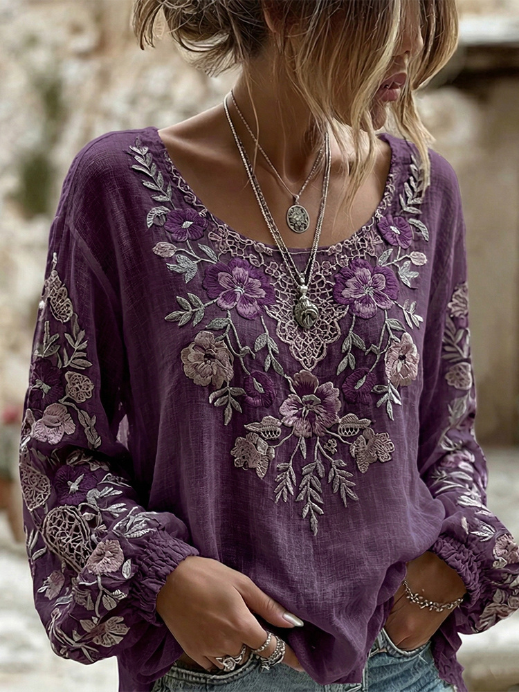 Vintage Boho Rose Embroidered Long Sleeve Cozy Linen T Shirt