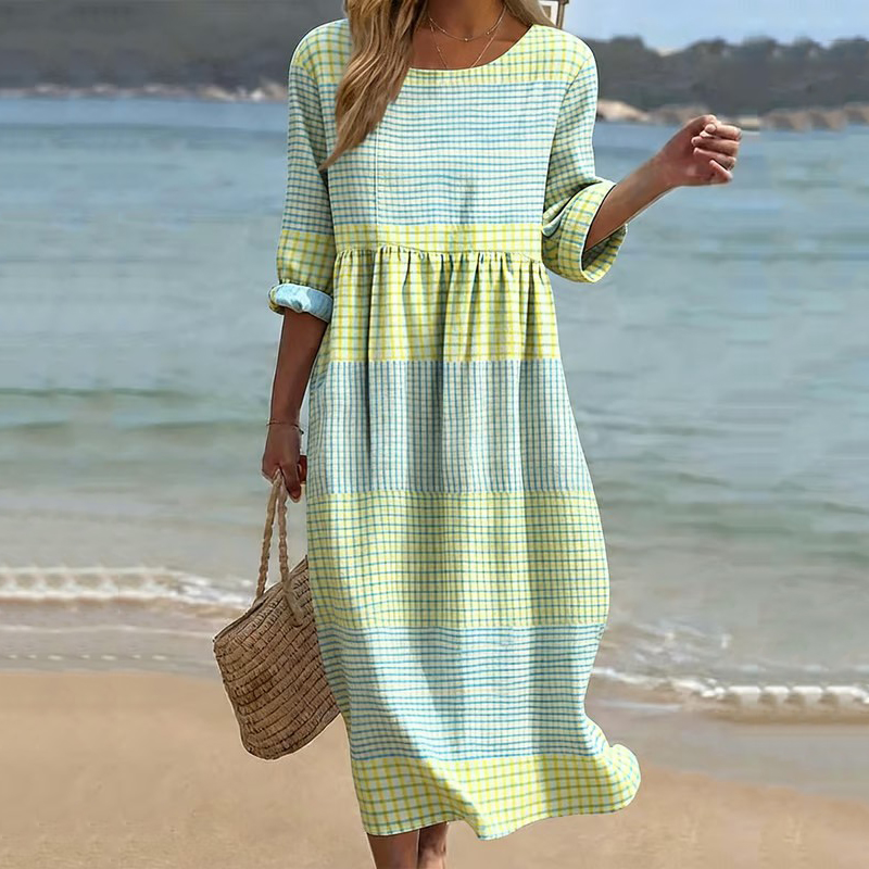 Women's Japanese Color Block Art Linen-blend Maxi Dress