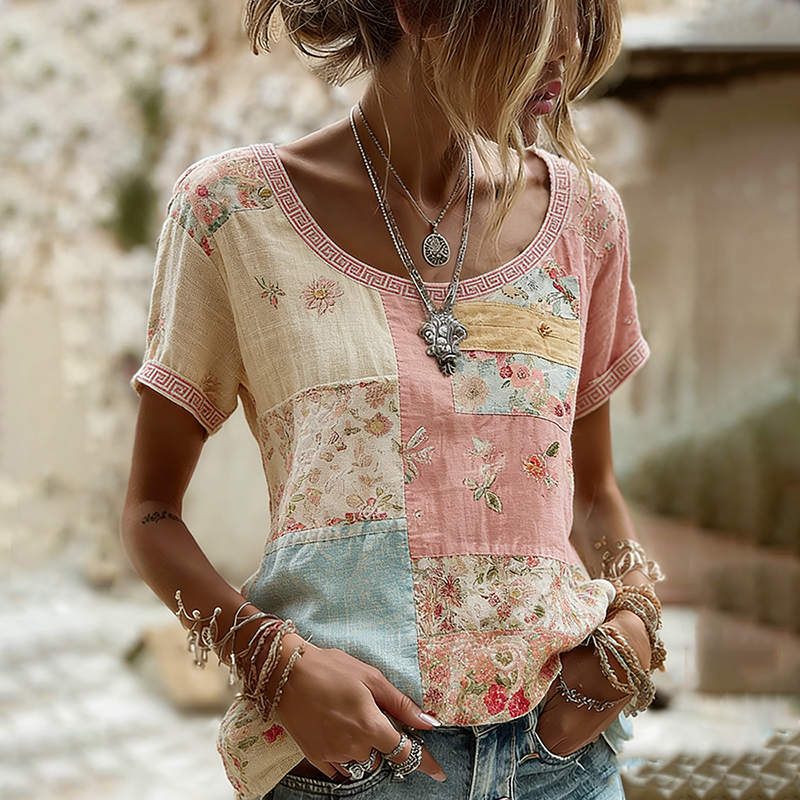 Women's Bohemian Patchwork Floral Casual Crew-neck T-shirt