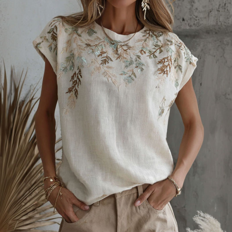 Women's White Floral Art Embroidery Linen Blend Short Sleeve Top