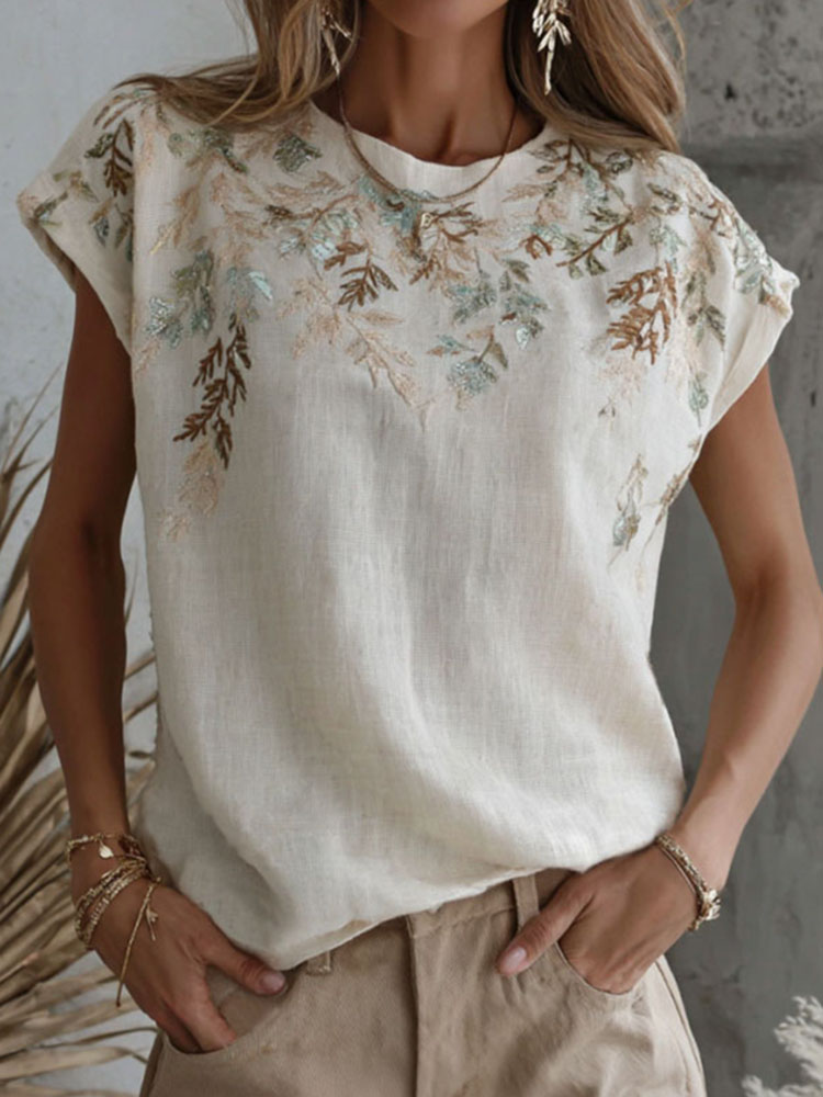 Women's Spring Floral Embroidered Art Print Flowy Linen Blend Short Sleeve Casual Tops