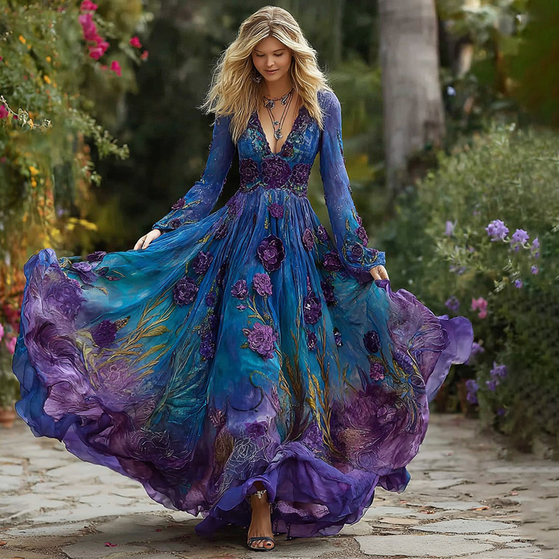 Women's Vintage Roses Embroidery Art V-neck Long Sleeves Maxi Dress