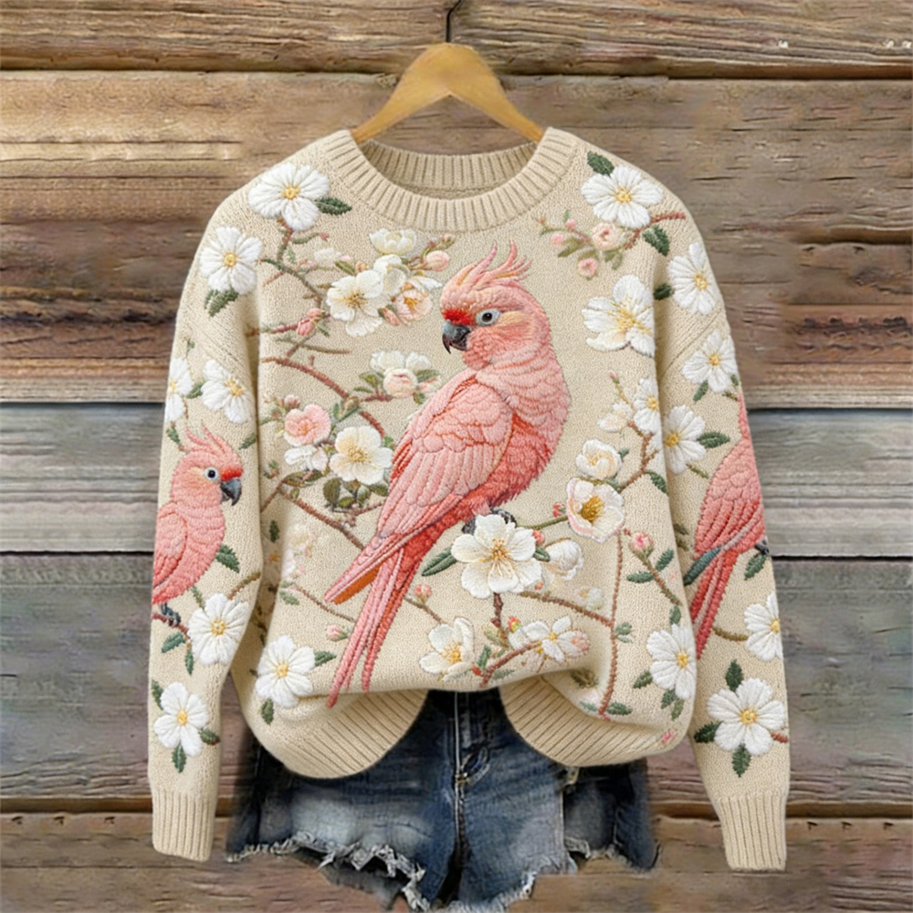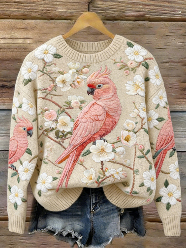 Japanese Floral & Forest Parrot Pattern Crew Neck Cozy Sweater