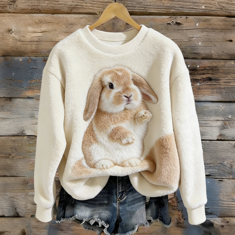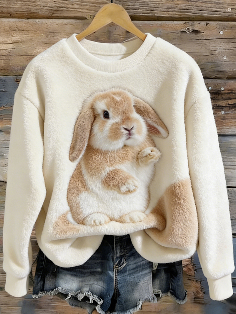 Women's Cute Bunny Pattern Winter Plush Crew Neck Sweatshirt