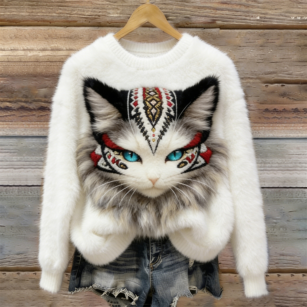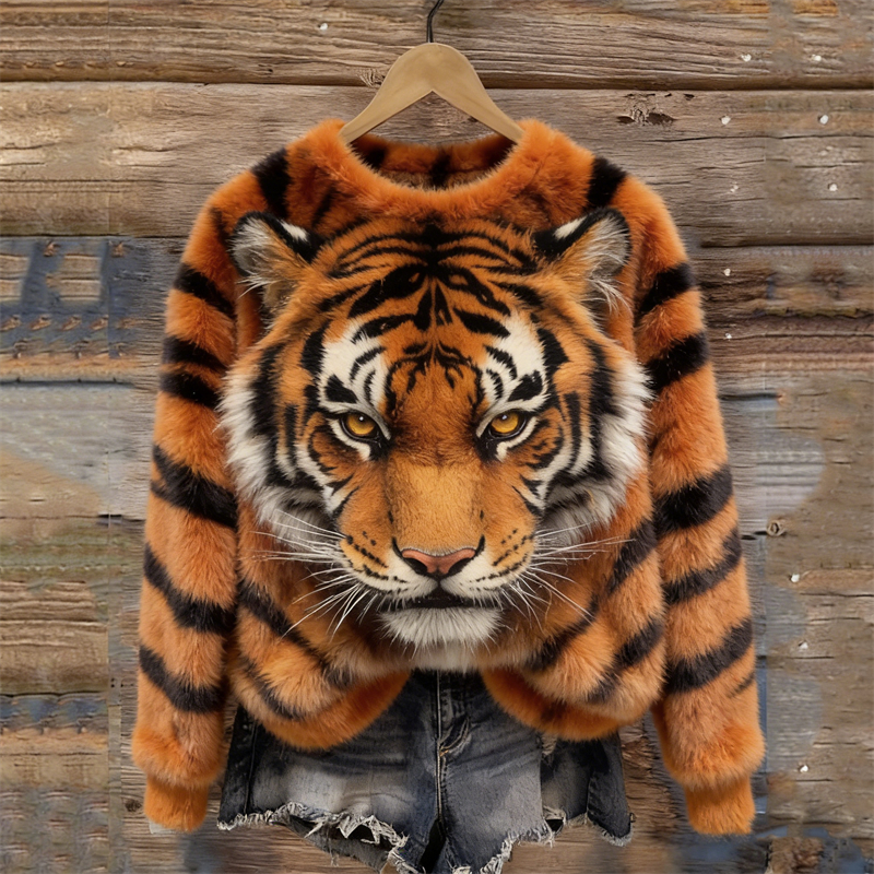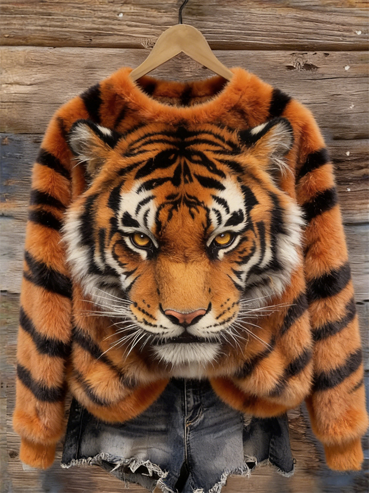 Vintage Fuzzy Tiger & Pattern Cozy Plush Sweatshirt