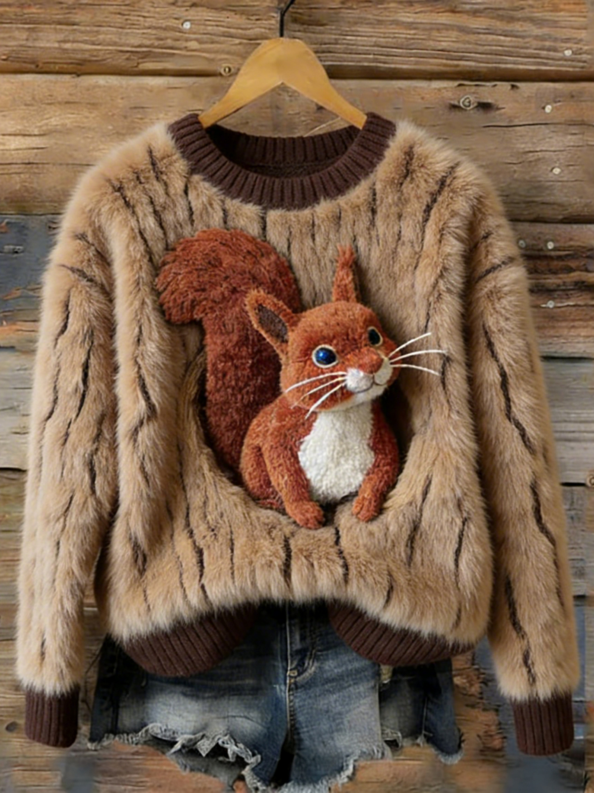 Animal Pattern Crew Neck Cozy Plush Sweatshirt