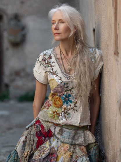 Bohemian-style Art Patchwork Three-dimensional Embroidery Floral Bead Embroidery V-neck Short-sleeved Shirt