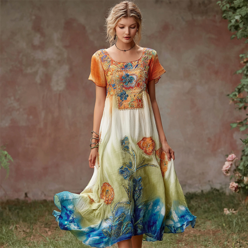 Boho Style Sunset Floral Tie-dye Women's Linen Short Sleeve Maxi Dress
