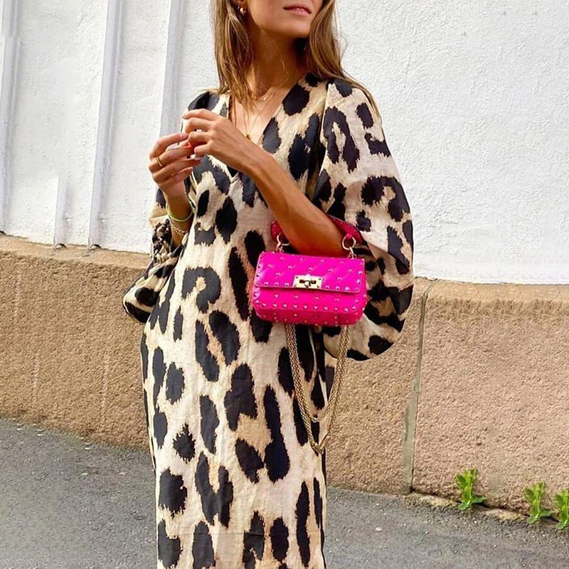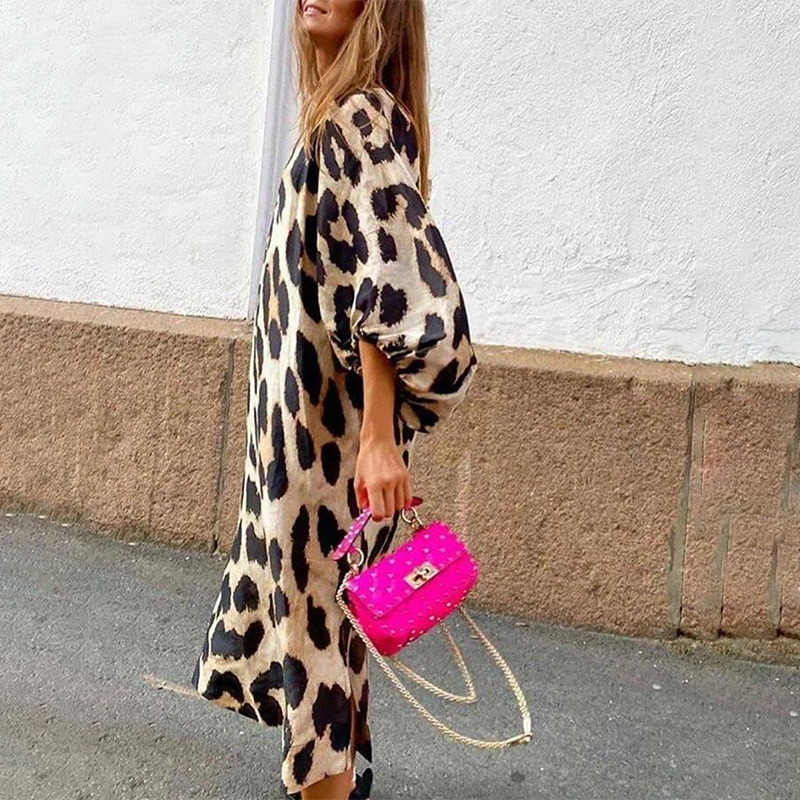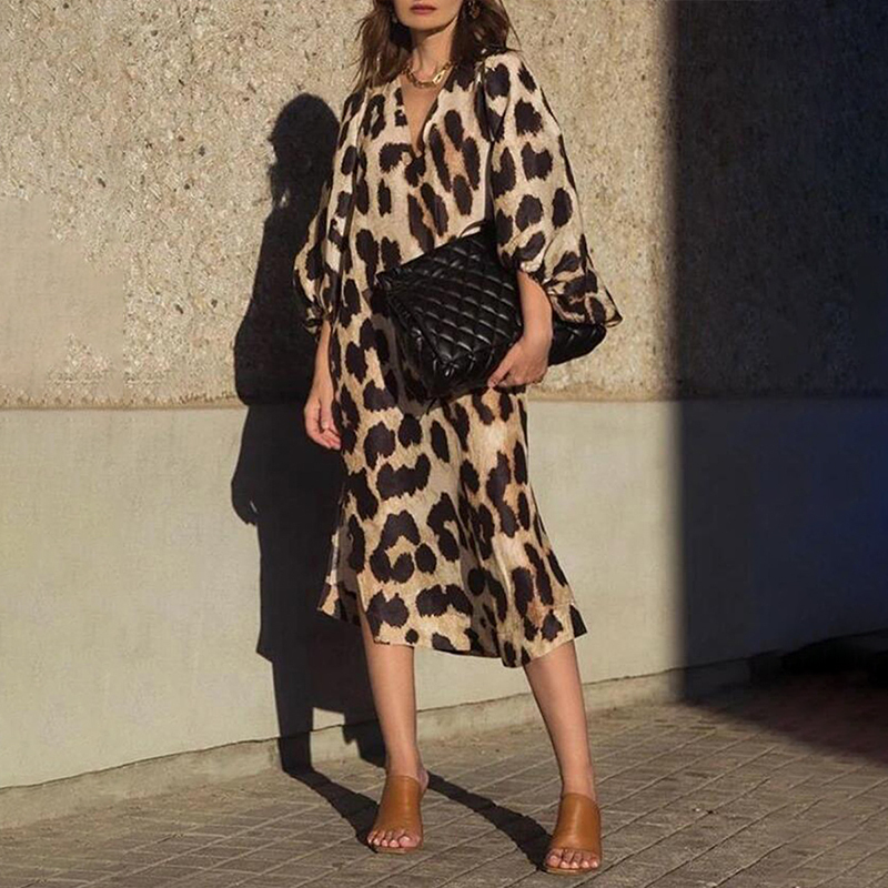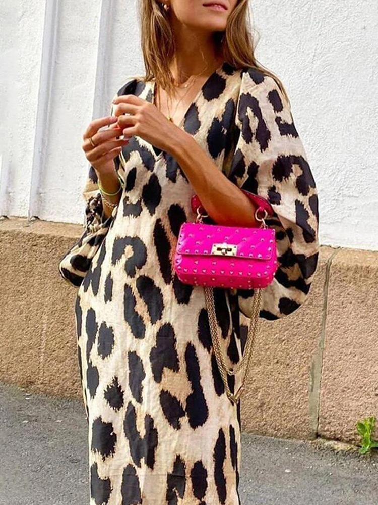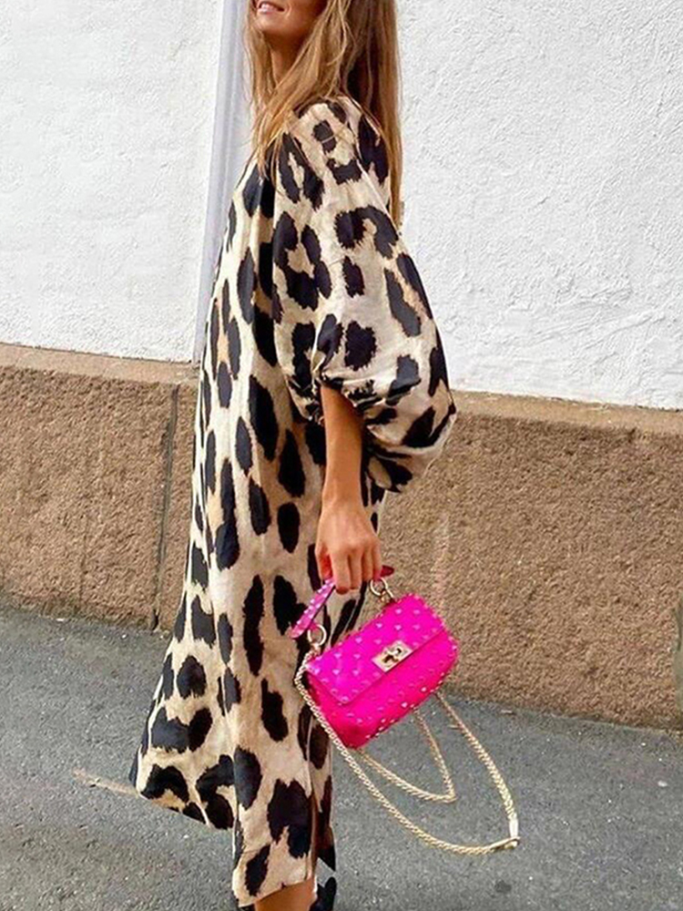 Casual V-Neck Leopard Print Lantern Sleeve Dress