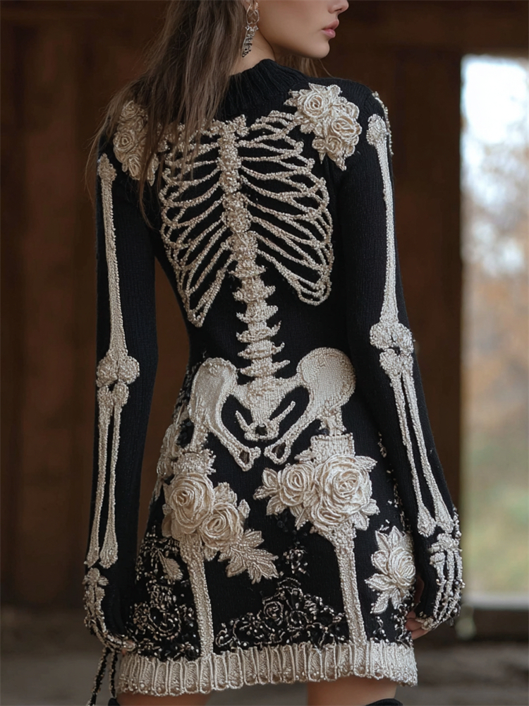 Classy Skeleton Floral Glitter Beaded Cozy Knit Sweater Dress