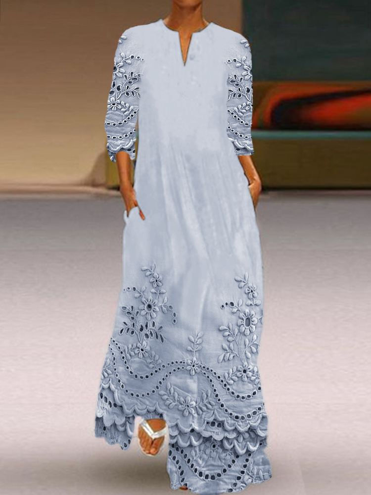 Cottage Floral Embroidered Lace Hem Flowy Maxi Dress