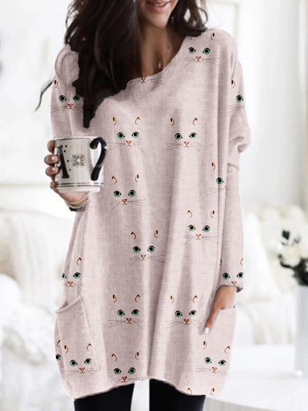 Cute Cat Face Pattern Patch Pocket Comfy Tunic