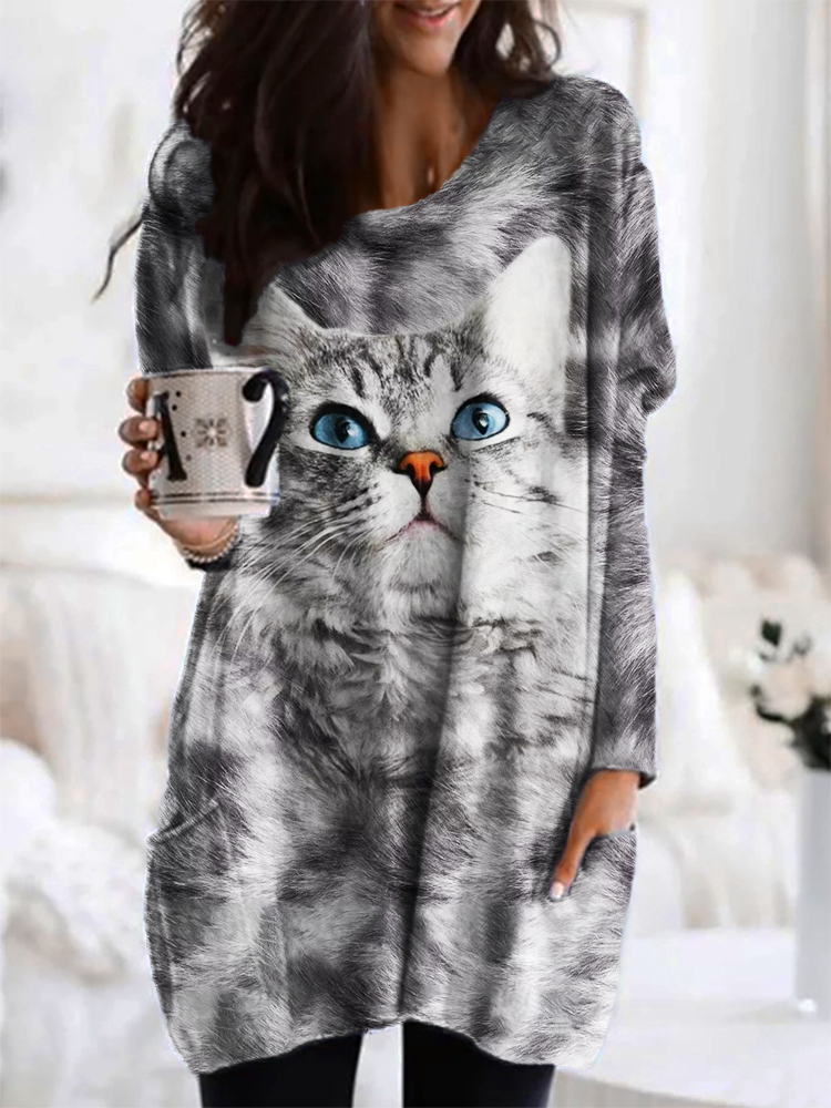 Cute Gray Cat Print Women's Long T-Shirt
