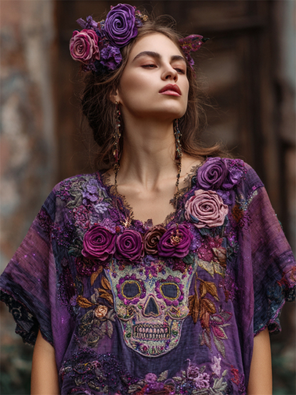 Day Of The Dead Purple Roses Sugar Skull Embroidered Fiber Art Linen Shirt