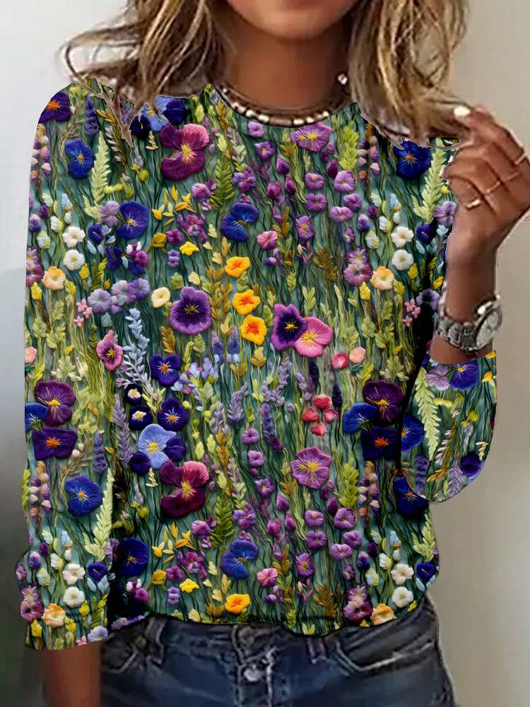 Elegant Violet Wildflower Embroidery Art Comfy T Shirt