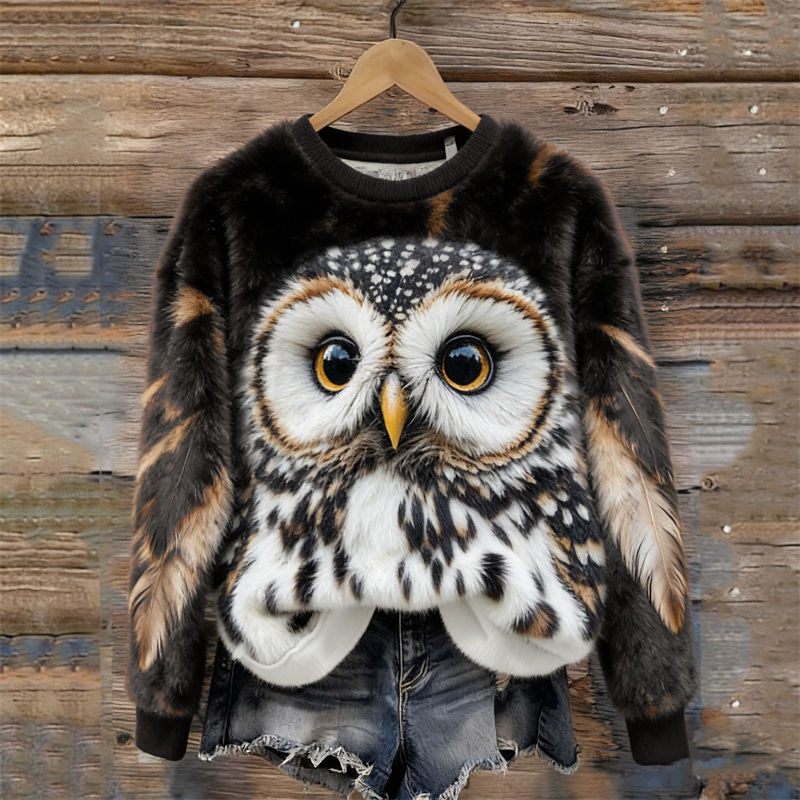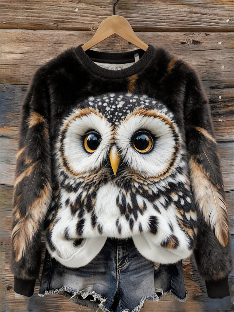 Forest Owl Inspired Contrast Cozy Plush Sweatshirt