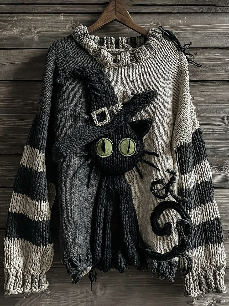 Halloween Black Cat Striped Knitted Warm Crew Neck Sweater