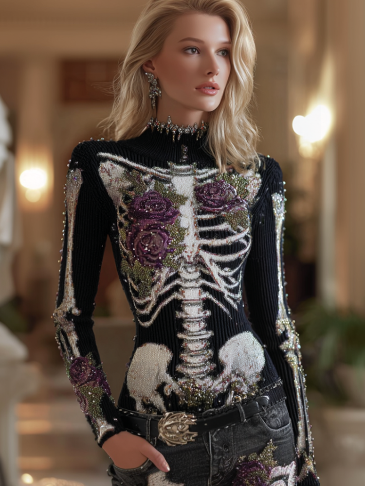 Halloween Human Anatomy Style Bone Pattern And Flower Pattern Combined Design Women's Round Neck Knit Sweater