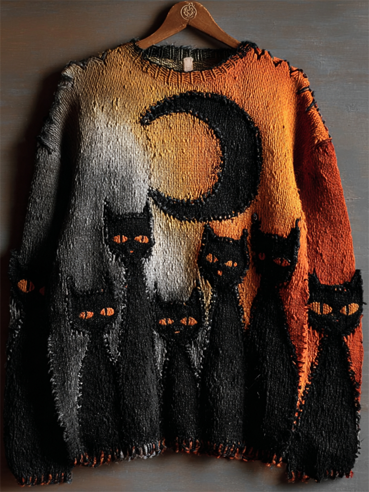 Halloween Night Black Cats Gradient Cozy Knit Sweater